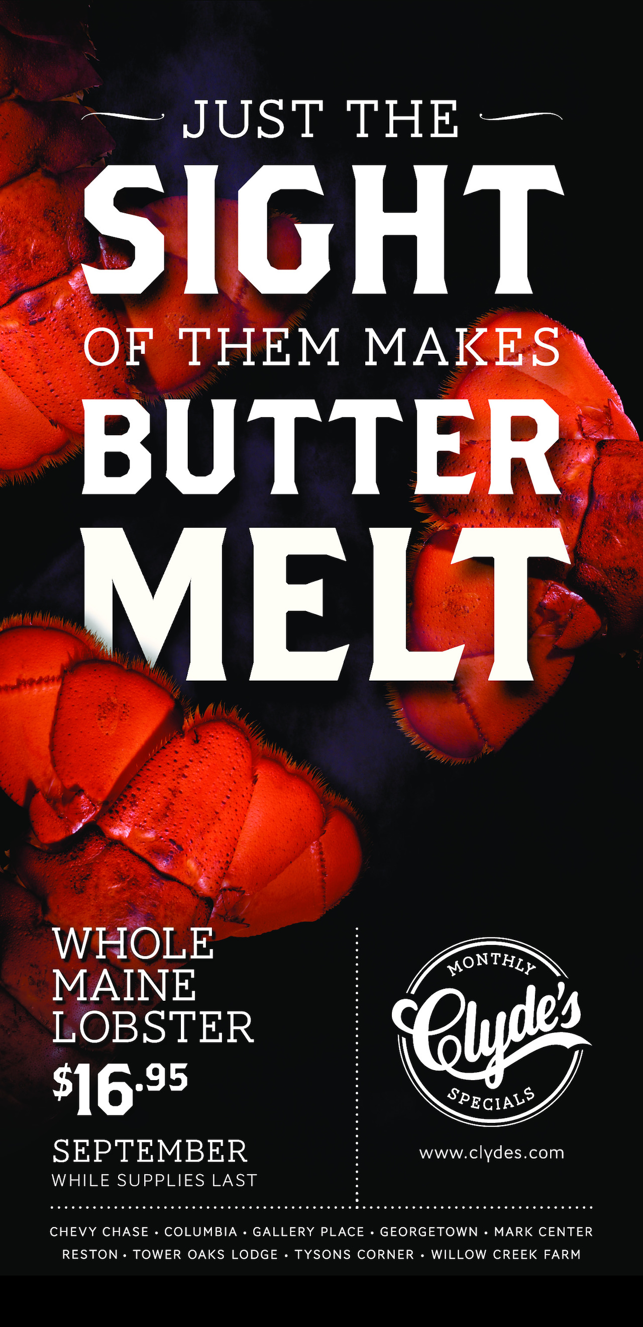 JUST THE SIGHT OF THEM MAKES BUTTER MELT. WHOLE MAINE LOBSTER $16.95 SEPTEMBER WHILE SUPPLIES LAST. MONTHLY Clyde's SPECIALS www.clydes.com CHEVY CHASE • COLUMBIA • GALLERY PLACE • GEORGETOWN • MARK CENTER RESTON • TOWER OAKS LODGE • TYSONS CORNER • WILLOW CREEK FARM